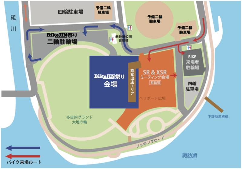 ・会場エリアの駐車場は二輪専用の駐輪場です。入口・出口を設け、一方通行となります。