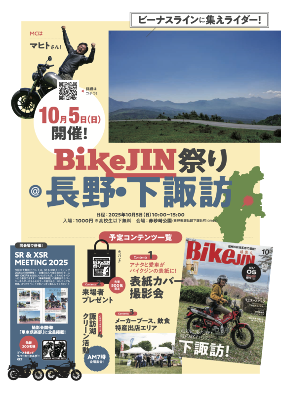 今年の秋に行われるBikeJIN祭りは、久しぶりの本州開催です!10月は長野県・下諏訪で秋の絶景に出会う2連発。バイクで走って、仲間と集まって、心に残る最高の時間を一緒に過ごしましょう!