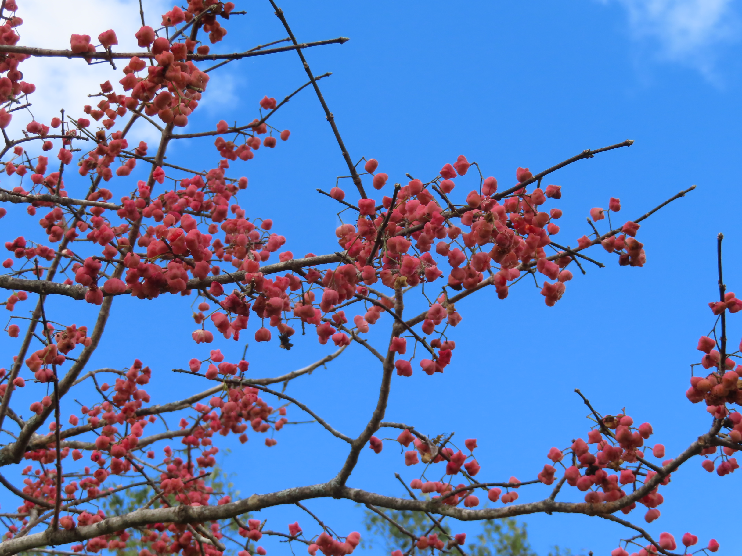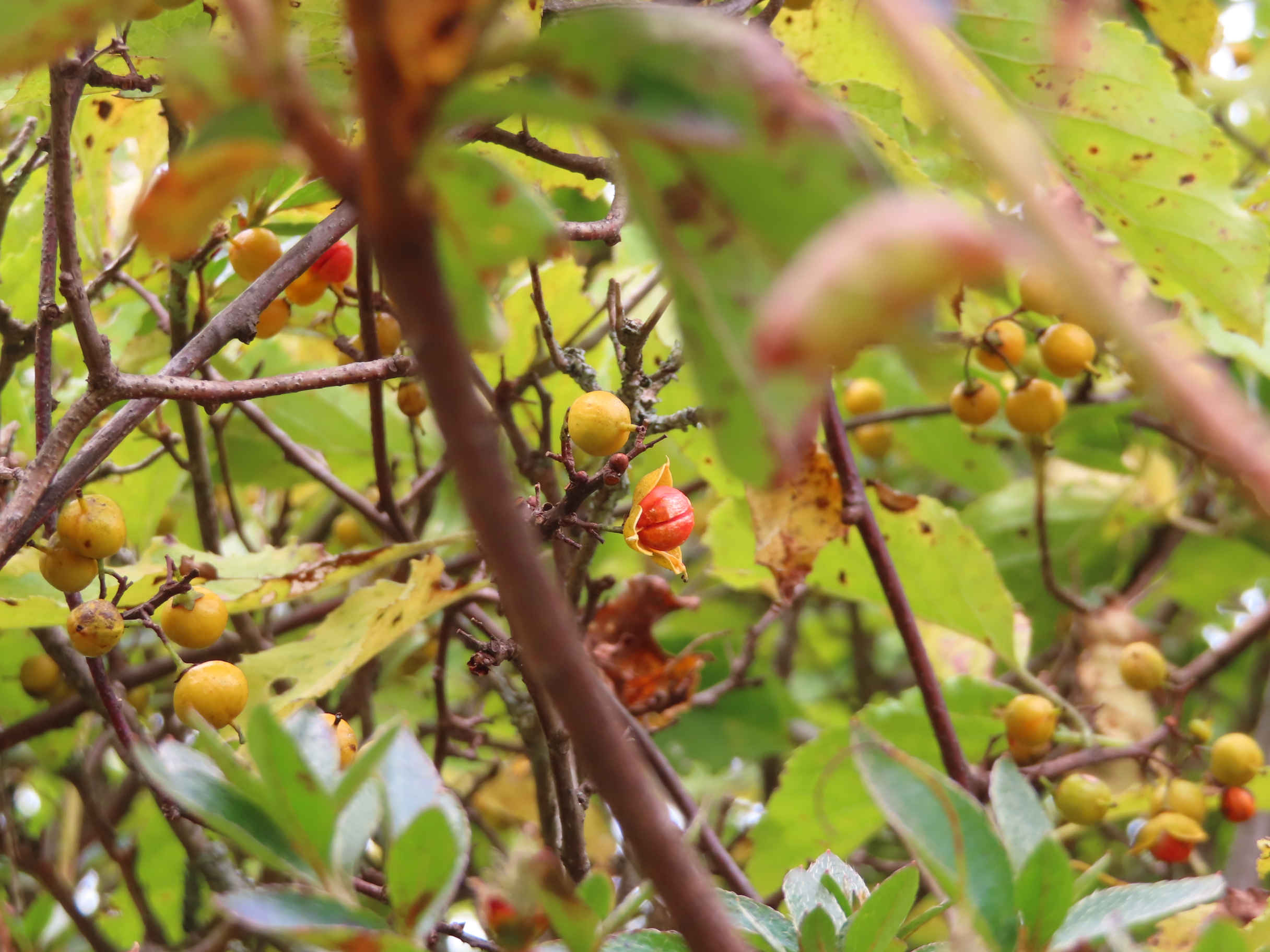 ツルウメモドキの実は弾けて、きれいなオレンジ色の種が。