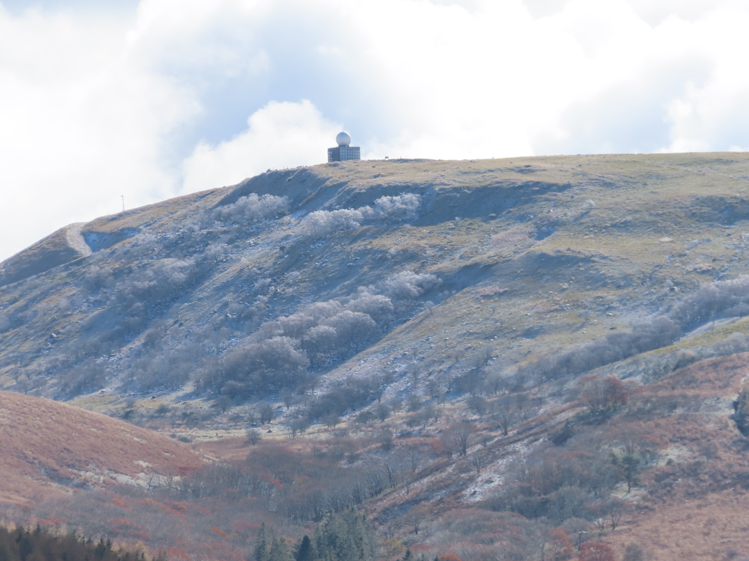 車山方面をズームアップすると樹叢(じゅそう)に霧氷が。霧ヶ峰の一部では冠雪も確認できました。